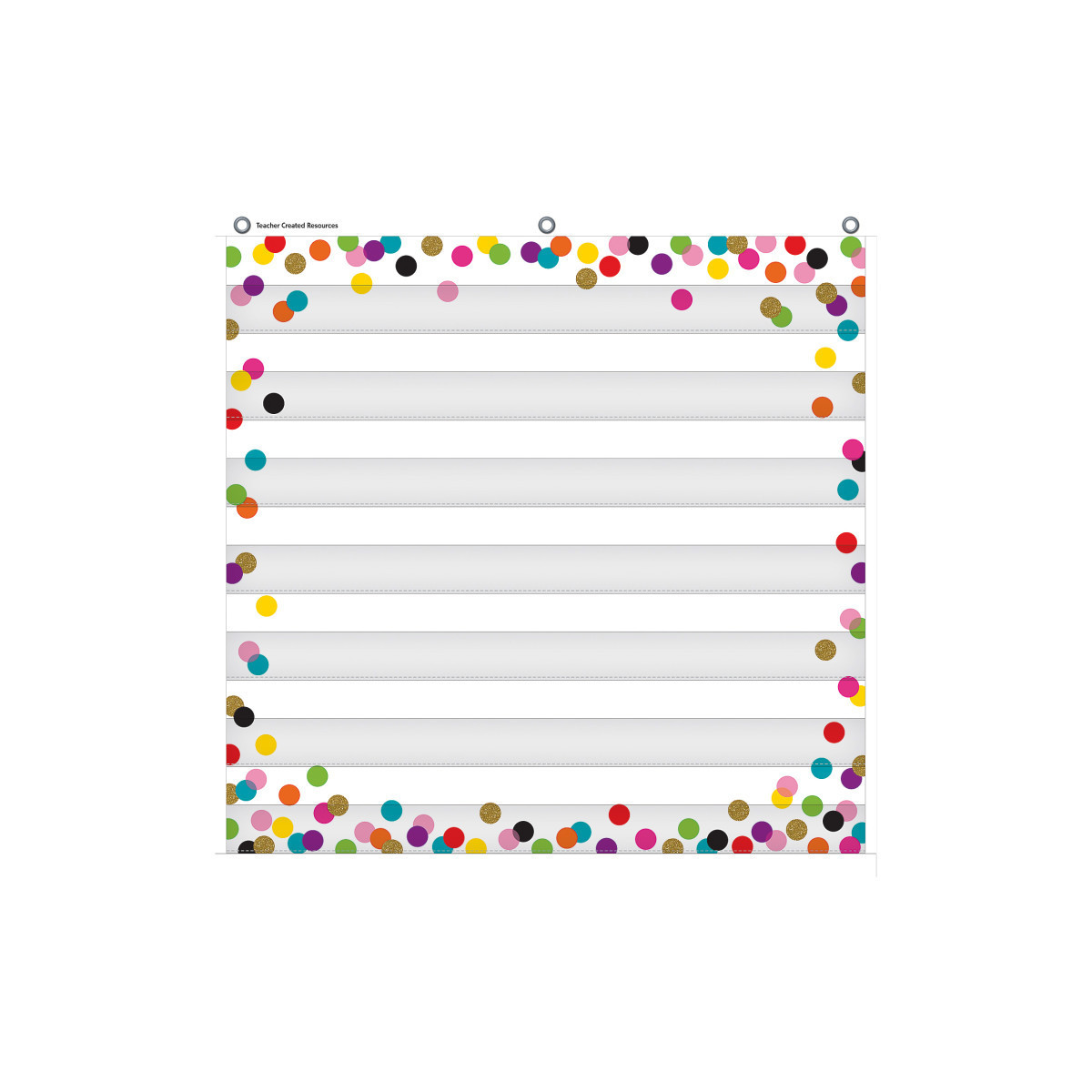 This lightweight and durable Confetti pocket chart features a colorful design and hangs easily from sturdy, metal grommets. Can be used as a classroom behavior chart or for organizing and categorizing classroom information. Perfect for KWL activities (what you Know, Want to know, and what you Learned), word walls, identifying word parts (root words, prefixes, and suffixes), showing cause and effect, and more! The non-porous surface is easy to clean and can be wiped-down or sprayed with disinfectant to help prevent the spread of germs. Measures 28" x 28".