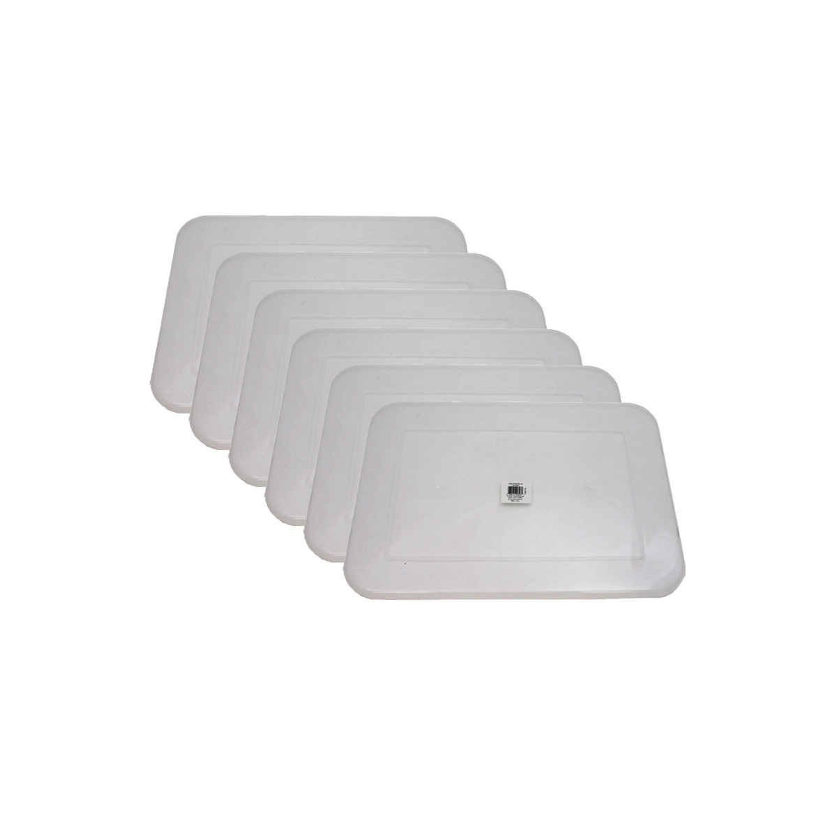 Keep your storage bins securely closed with these clear plastic lids. Measures approximately 11-3/8" L x 16-3/8" W x 1/2" H. Sold as a pack of 6 lids.