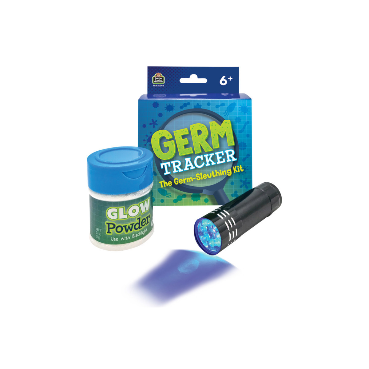 - Includes a germ-tracking blacklight, glow powder, and activity suggestions.