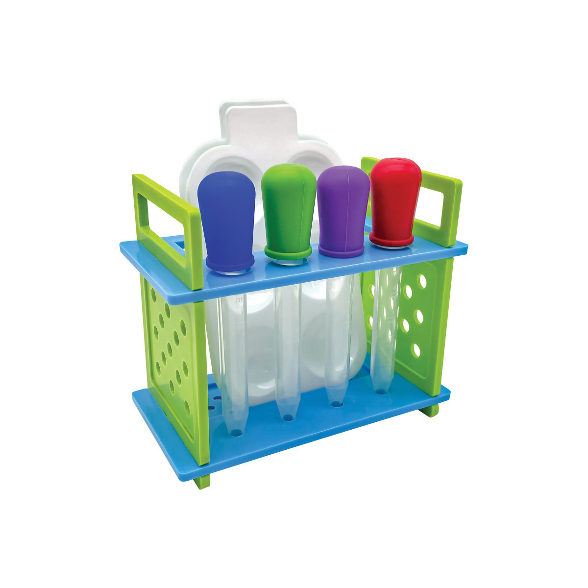 Make science fun with hands-on activities that encourage experimentation, observation, and analysis. Use the five provided double-sided activity cards to perform simple experiments using common household and classroom materials, ask observation questions, and introduce basic scientific concepts. Four eyedroppers approximately 4-3/4" long with 5 mL capacity (about 1 tsp). Two spot plates have 6 wells and measures 3-1/2" x 5". Storage stand comes in 4 pieces and measures approximately 5-3/4" L x 3" W x 4-1/4" H when assembled.