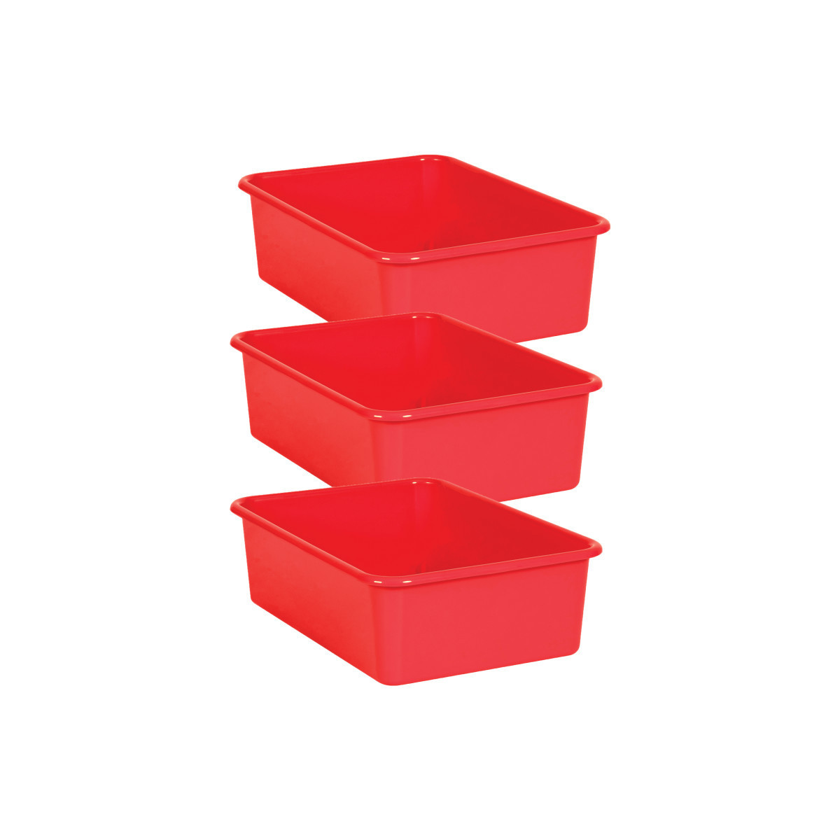 Create a beautifully organized classroom with these large storage bins. Keep books, notepads, toys, games, and supplies in these decorative organizers that feature a sturdy plastic design. Multiple bins can be stacked for easy storage. Each bin measures 16-1/4 "L x 11-1/2"W x 5"H. Sold as a pack of 3 bins.