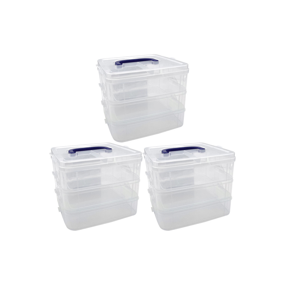 These clear storage containers are the perfect organizational tool for the home or classroom. Use them for storing and organizing manipulatives, crafts, classroom supplies, and more! Lid has a built-in handle. Containers snap-lock together for easy transportation and storage. Sold as a pack of 3 three-tier storage containers.