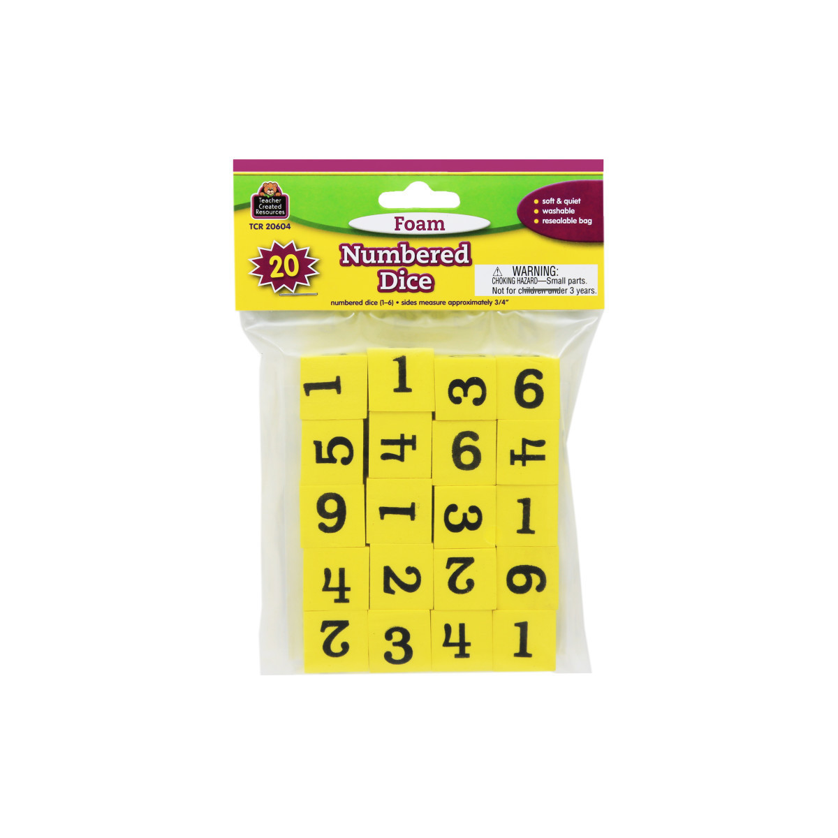 Yellow foam dice with numerals 1-6 are lightweight, soft, quiet, and washable. Square edges stop the dice from rolling too far. 3/4" cubes. Teaching tips are included. Each pack includes 20 dice in a resealable storage bag.