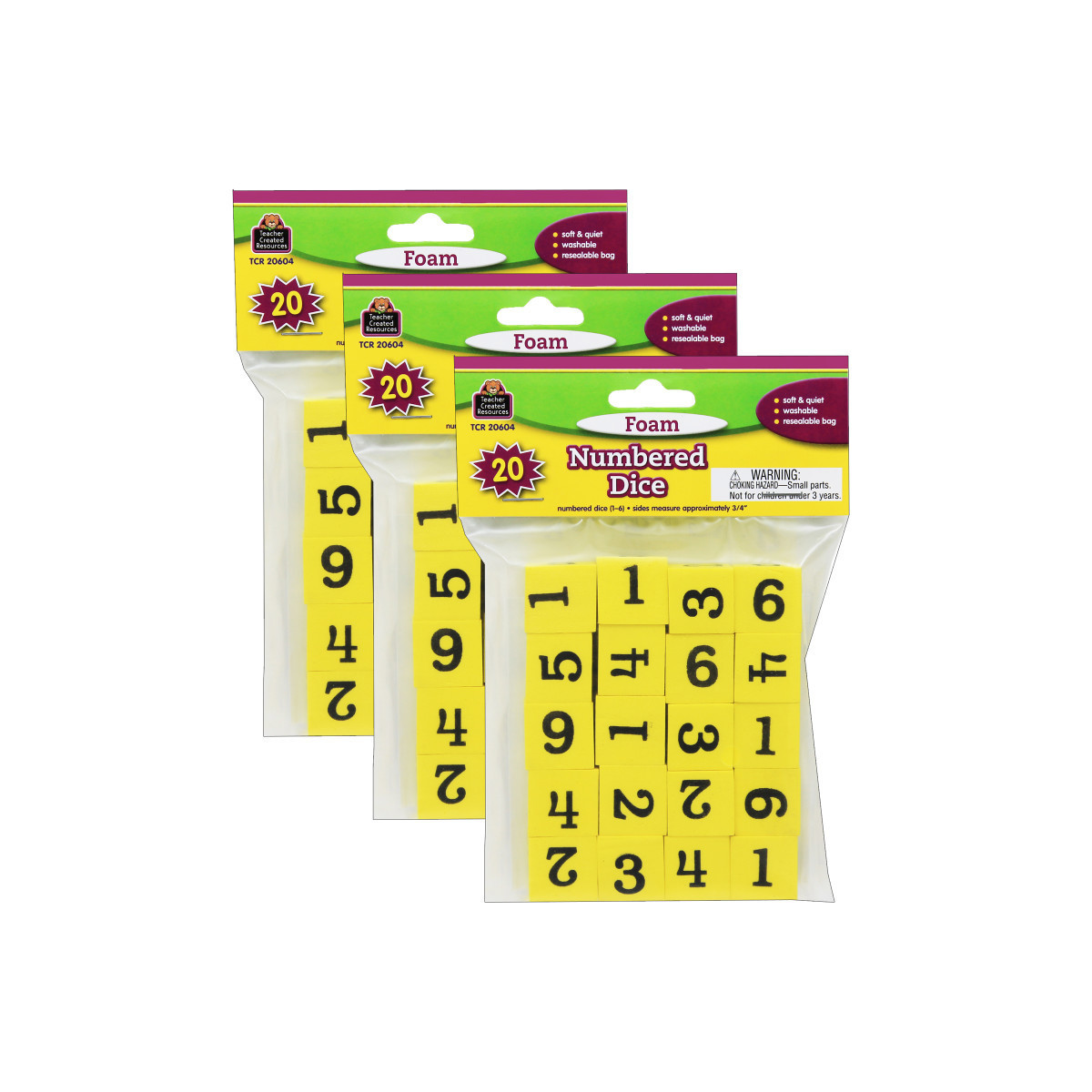 Yellow foam dice with numerals 1-6 are lightweight, soft, quiet, and washable. Square edges stop the dice from rolling too far. 3/4" cubes. Teaching tips are included. Each pack includes 20 dice in a resealable storage bag. Sold as 3 packs for a total of 60 dice.
