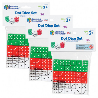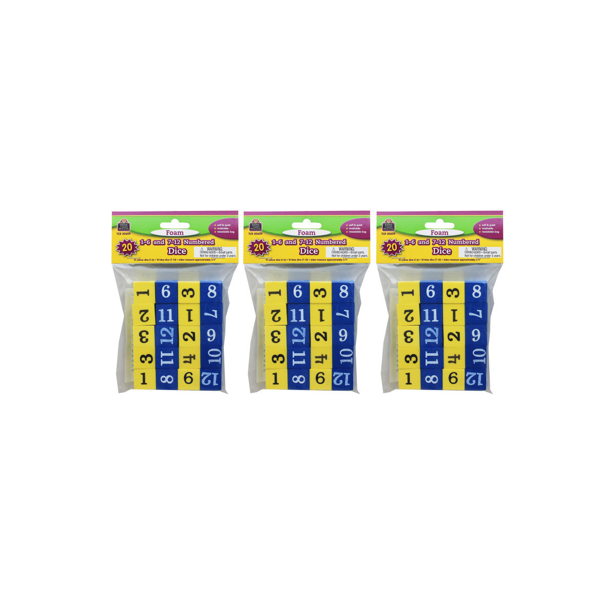 Yellow dice have numerals 1-6. Blue dice have numerals 7-12. Foam is lightweight, soft, quiet, and washable. Square edges stop the dice from rolling too far. Comes in a resealable storage bag. Teaching tips are included. 3/4" cubes. Each pack includes 20 dice, 10 yellow and 10 blue. Sold as 3 packs for a total of 60 dice.