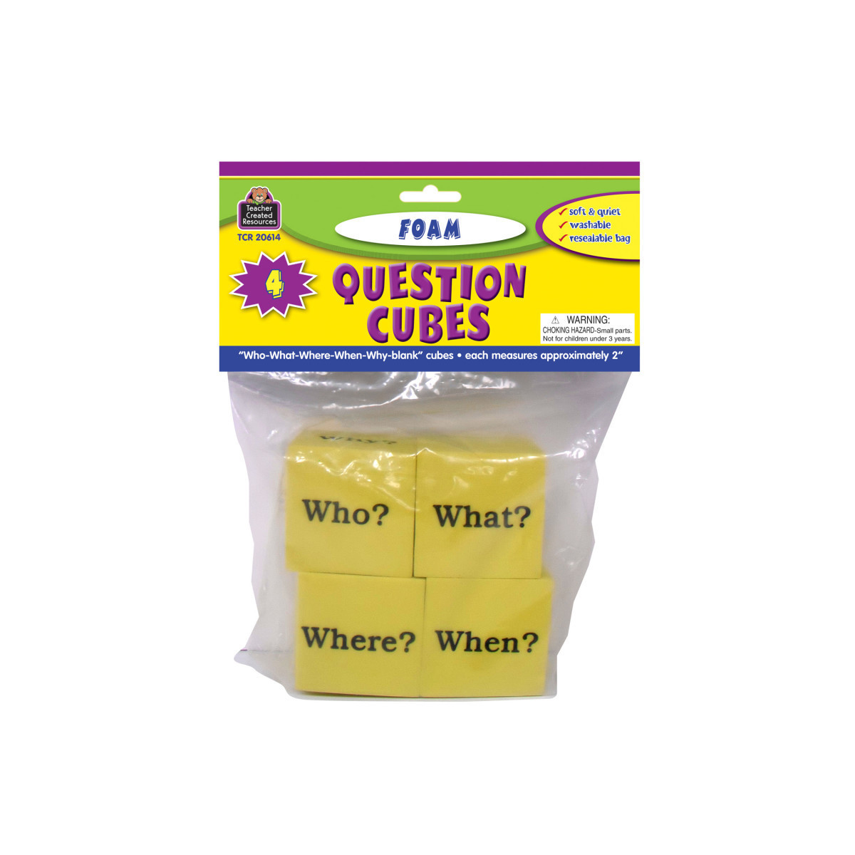 Four 2-inch cubes get discussions and/or stories started. Each cube has Who? What? When? Where? Why? and one blank side. Foam is lightweight, soft, quiet, and washable. Square edges stop the cubes from rolling too far. Comes in a resealable storage bag. Teaching tips are included.