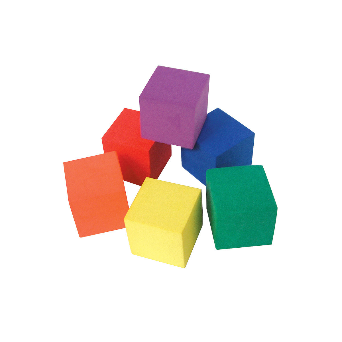Practice sorting, patterning, visual discrimination, fine motor skills, and basic math concepts with 30 blank cubes in 6 different colors. 1-inch cubes. Foam is lightweight, soft, quiet, and washable. Square edges stop the cubes from rolling too far. Comes in a resealable storage bag. Teaching tips are included.
