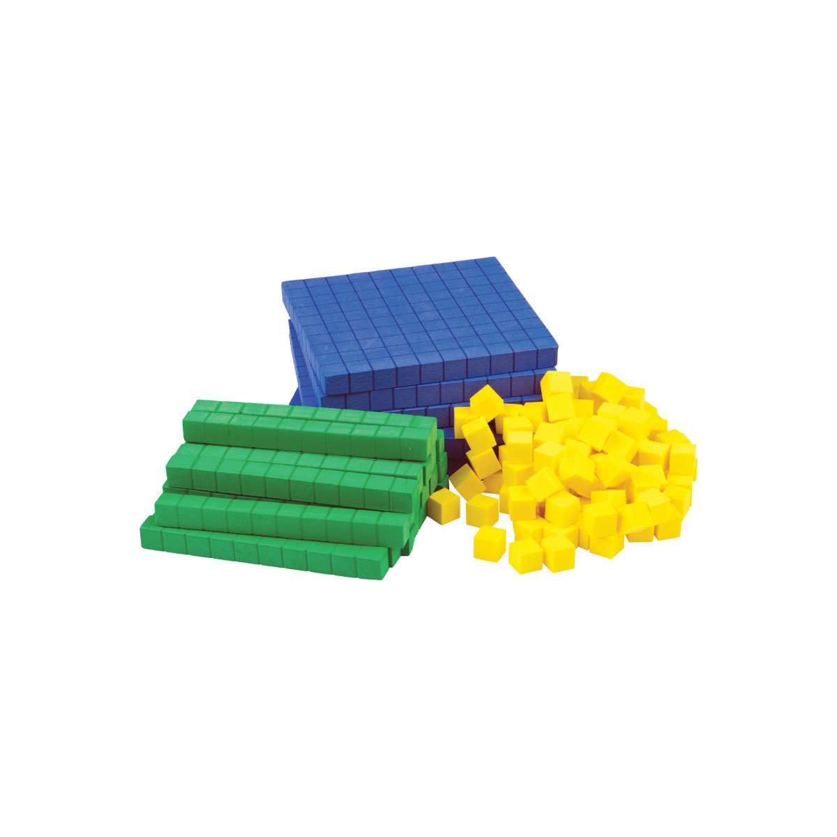 Includes 100 of the 1-unit cubes (yellow); 20 of the 10-unit rods (green); and 5 of the 100-unit flats (blue).
