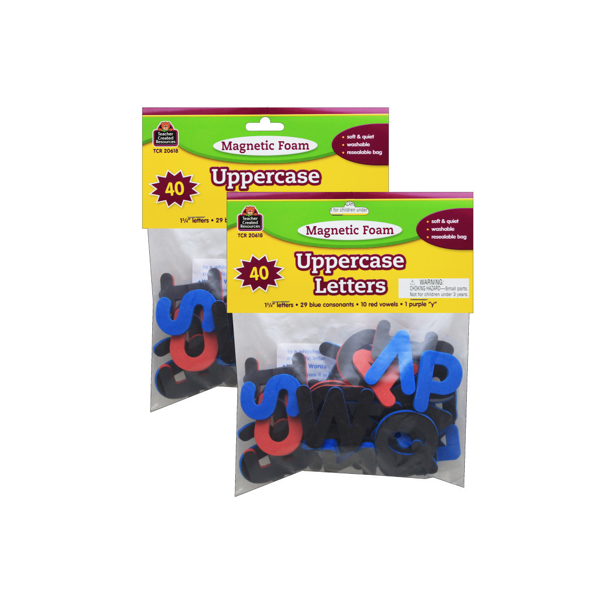 Practice alphabet-related skills with 40 uppercase letters measuring 1-3/4". 27 blue consonants, 12 red vowels, and 1 purple Y. Lightweight, washable foam coupled with magnetic backing makes the letters practical for any setting. Comes in a resealable storage bag. Teaching tips are included. Sold as 2 sets.