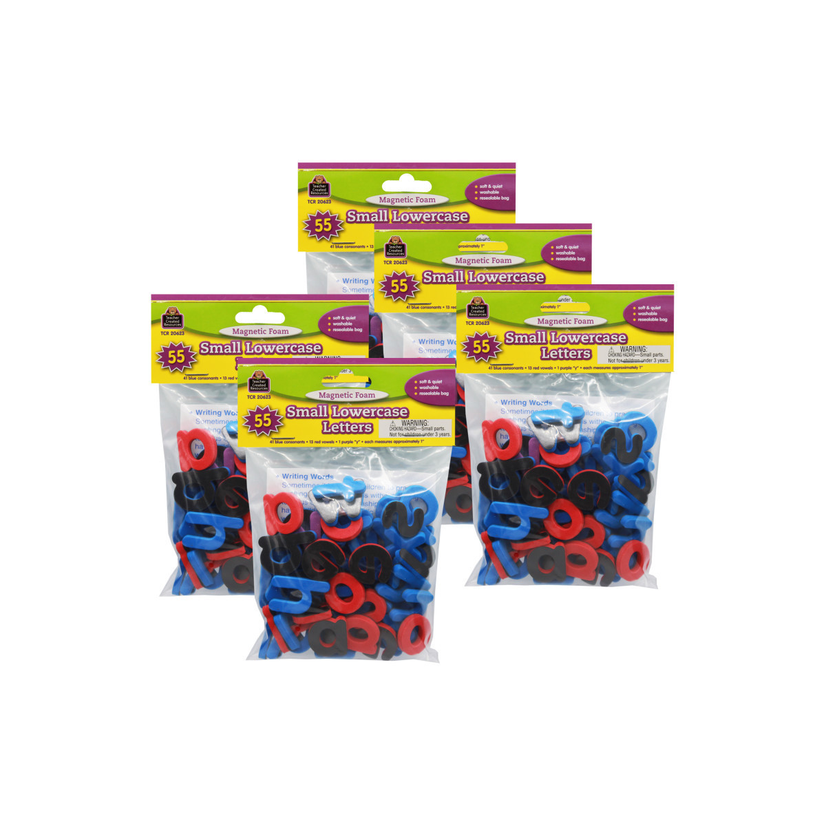 Practice alphabet-related skills with 55 lowercase letters measuring 1" to 1.25". 41 blue consonants, 13 red vowels, and 1 purple y. Lightweight, washable foam coupled with magnetic backing makes the letters practical for any setting. Comes in a resealable storage bag. Teaching tips are included. Sold as a 5 packs, 275 letters total.