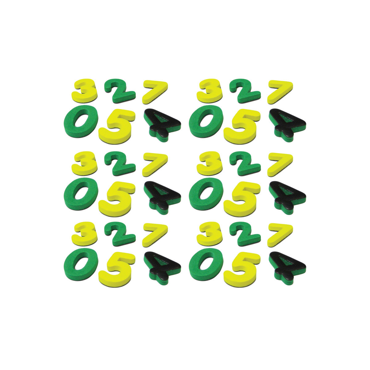 Practice math-related skills with numbers measuring 1-1/4" each. Lightweight, washable foam coupled with magnetic backing makes the letters practical for any setting. Comes in a resealable storage bag. Teaching tips are included. Each set includes 60 numbers, 6 each of numbers 0-9, 30 yellow (odd) and 30 green (even). Sold as 6 sets for a total of 360 numbers.