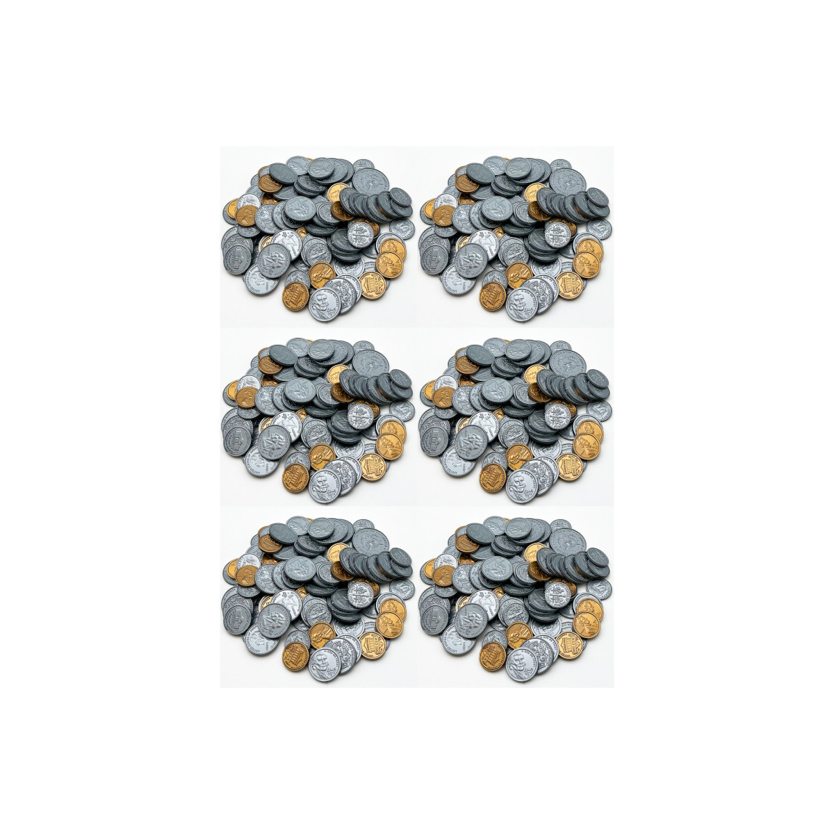 Sold as 6 packs, each individual pack includes 110 pieces: 30 pennies, 25 nickels, 25 dimes, 25 quarters, 5 fifty-cent pieces