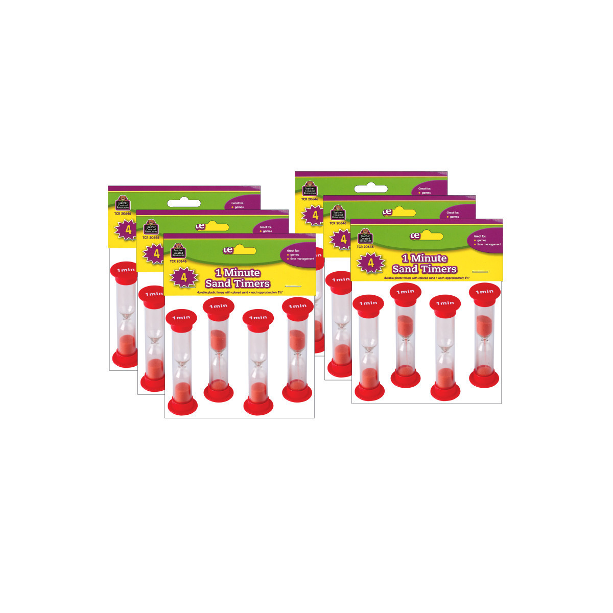 Race to see how much can be accomplished before time runs out. Great for games, timed test, and time management. Handy plastic timers with colored sand. Includes suggested activities. Each timer measures 1" x 3.5". Each pack includes 4 timers. Sold as 6 packs for a total of 24 timers.