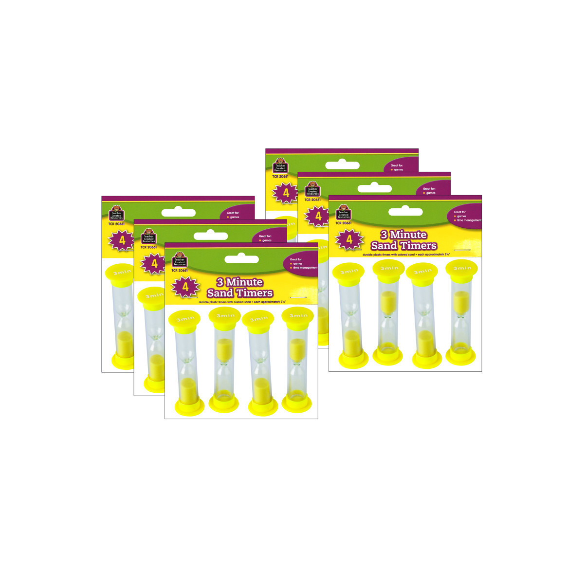 Race to see how much can be accomplished before time runs out. Great for games, timed test, and time management. Handy plastic timers with colored sand. Includes suggested activities. Each timer measures 1" x 3.5". Each pack includes 4 timers. Sold as 6 packs for a total of 24 timers.