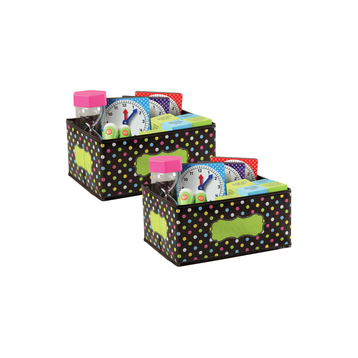 Classroom organization is easy with these decorative storage boxes and bins. Keep manipulatives, books, notepads, educational toys, games, and supplies in these decorative organizers that feature a write-on/wipe-off surface for convenient labeling and easy cleaning. The durable bins can also be folded for easy storage so you can take them out and use them year after year. Approximately 8" x 11" x 5". Sold as a pack of 2 bins.