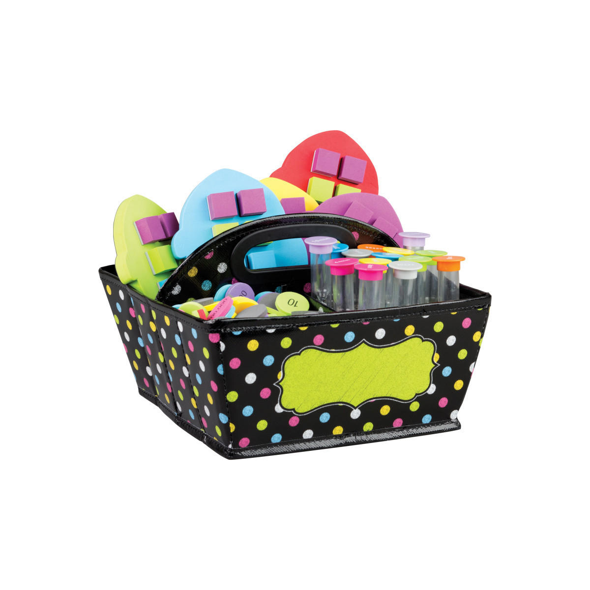 This cute storage caddy is a handy tote for your markers, calculators, timers, manipulatives, and many more small items that you want to keep within reach. Open or close the flexible divider to make one side into two separate compartments. Durable, wipe-down surface. Folds for compact storage! Measures 9" x 9" x 6".