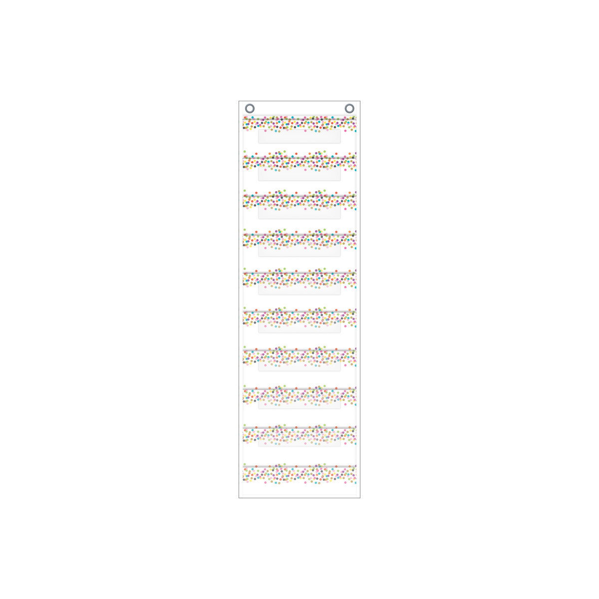 This lightweight and durable Confetti pocket charts features a colorful design and hangs easily from sturdy, metal grommets. 10 folder-sized pockets. Clear label holders. The non-porous surface is easy to clean and can be wiped-down or sprayed with disinfectant to help prevent the spread of germs. Measures 14" x 58".
