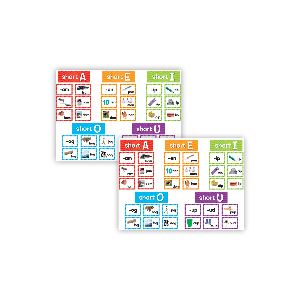 Students will quickly master pronunciation skills with these pocket chart cards. Each pack includes 205 total cards: 5 Header Cards (Short A, Short E, Short I, Short O, Short U), 36 short vowel sound cards, 145 short vowel picture word cards, and 19 blank cards. Cards measure 3-1/4" tall with a write-on/wipe-off surface. Sold as 2 packs for a total of 410 cards.