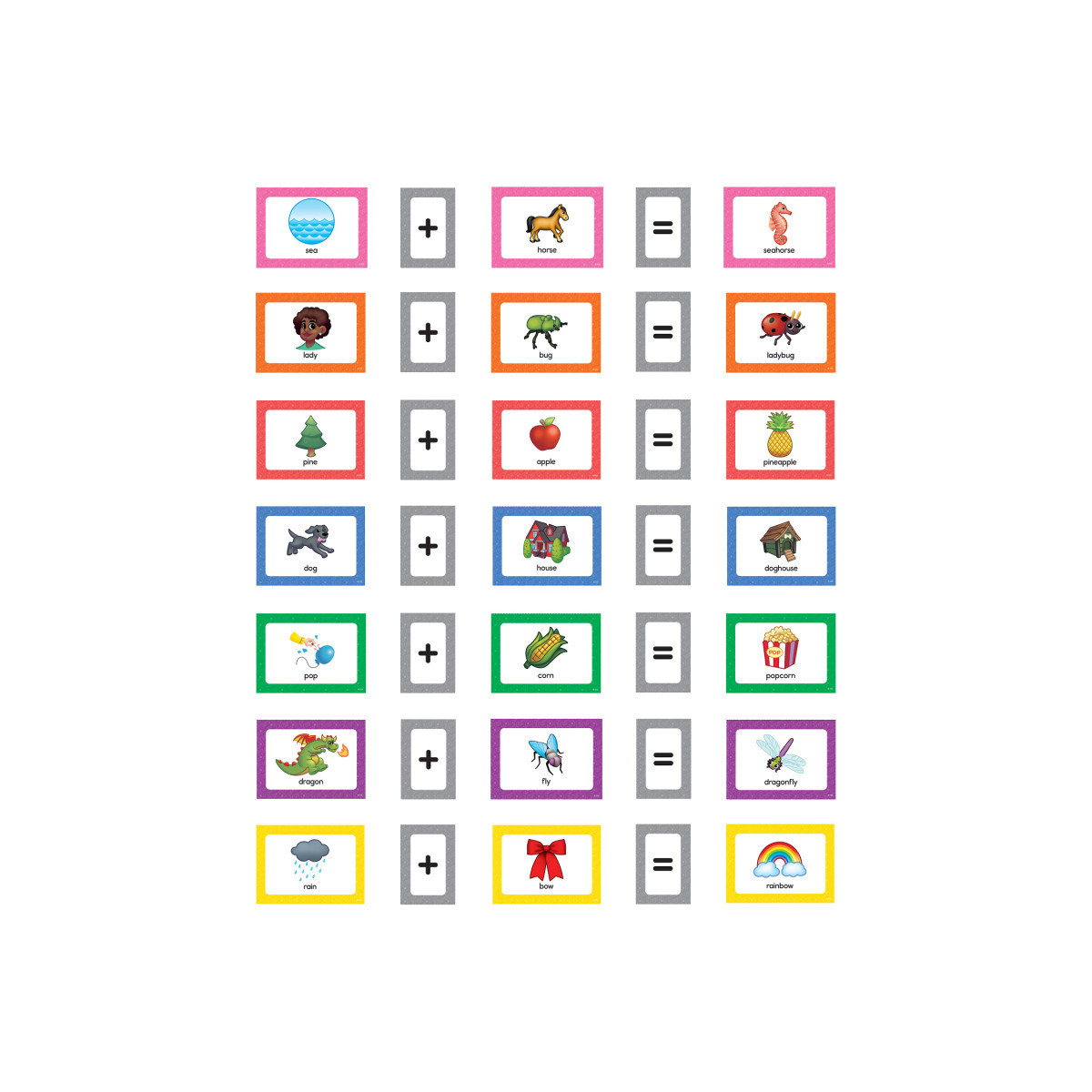 Write-on/Wipe-off pocket chart is great for any classroom setting. Includes 168 total cards: 102 picture word cards to build compound word equations, 6 blank cards, 30 "+" cards, and 30 "=" cards.