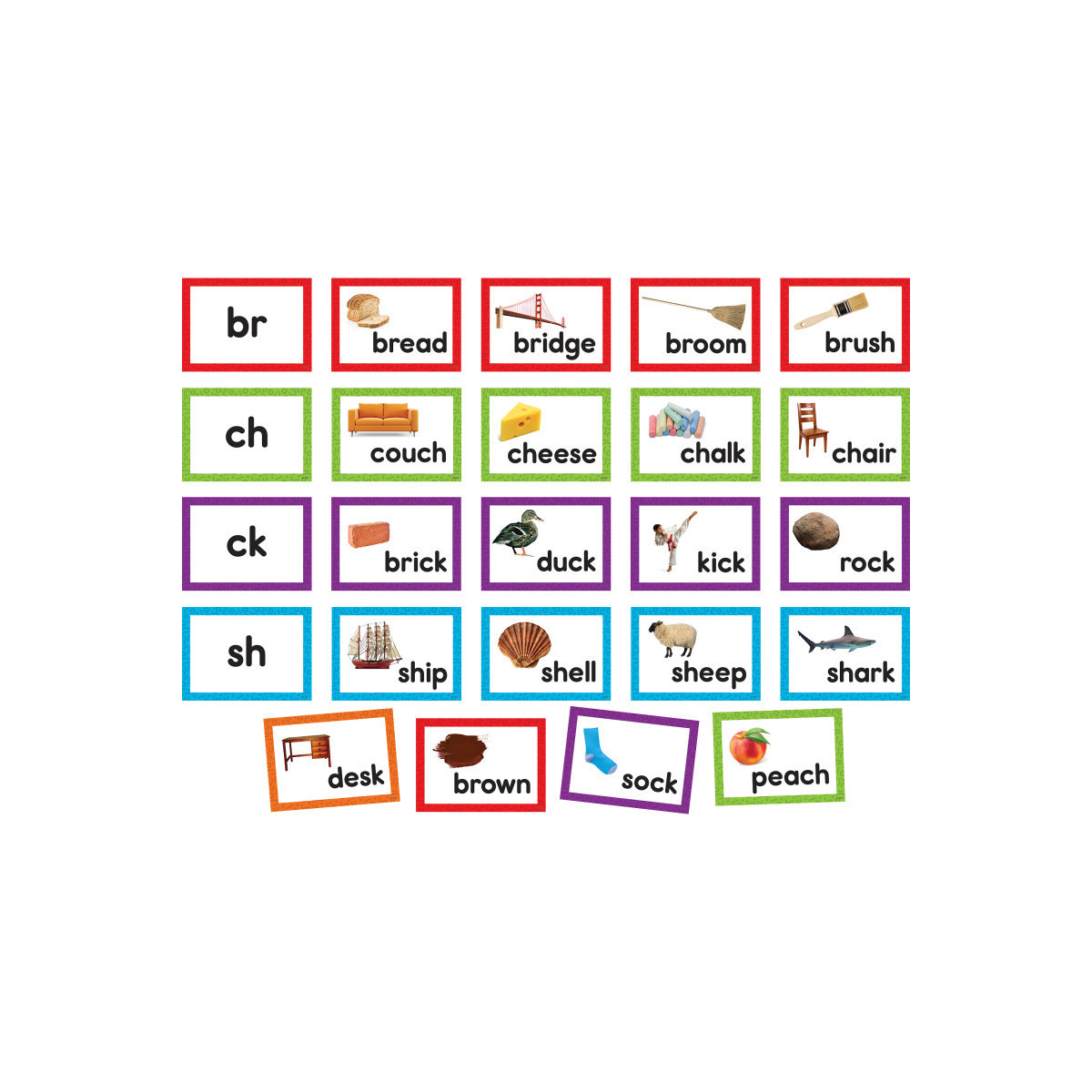 Write-on/Wipe-off pocket chart is great for any classroom setting. Each set includes 210 total cards: 35 blend and digraph sound cards, 170 picture word cards, and 5 blank cards Sold as 2 sets for a total of 420 cards.
