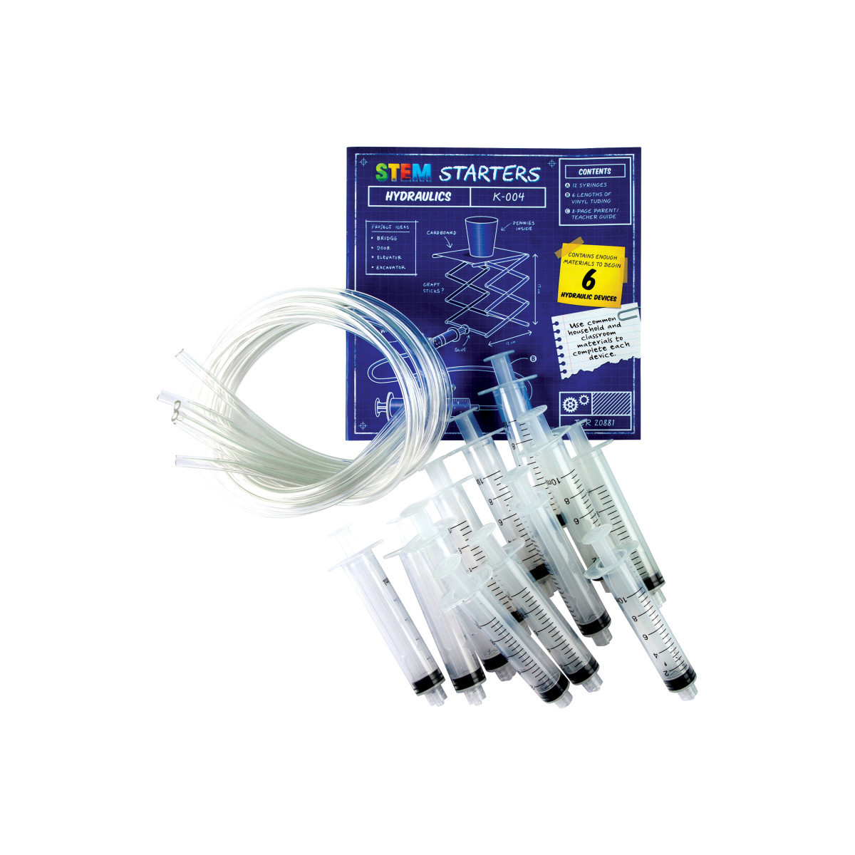 This activity kit challenges students to create a hydraulic-powered device. The essential pieces, plastic syringes, and vinyl tubing are provided; it's up to the young scientists to determine how best to utilize their hydraulic system. Using the engineering design process students will create, evaluate, and redesign their simple machine until their objective is met. Includes enough materials to begin 6 hydraulic devices. 18 pieces total.