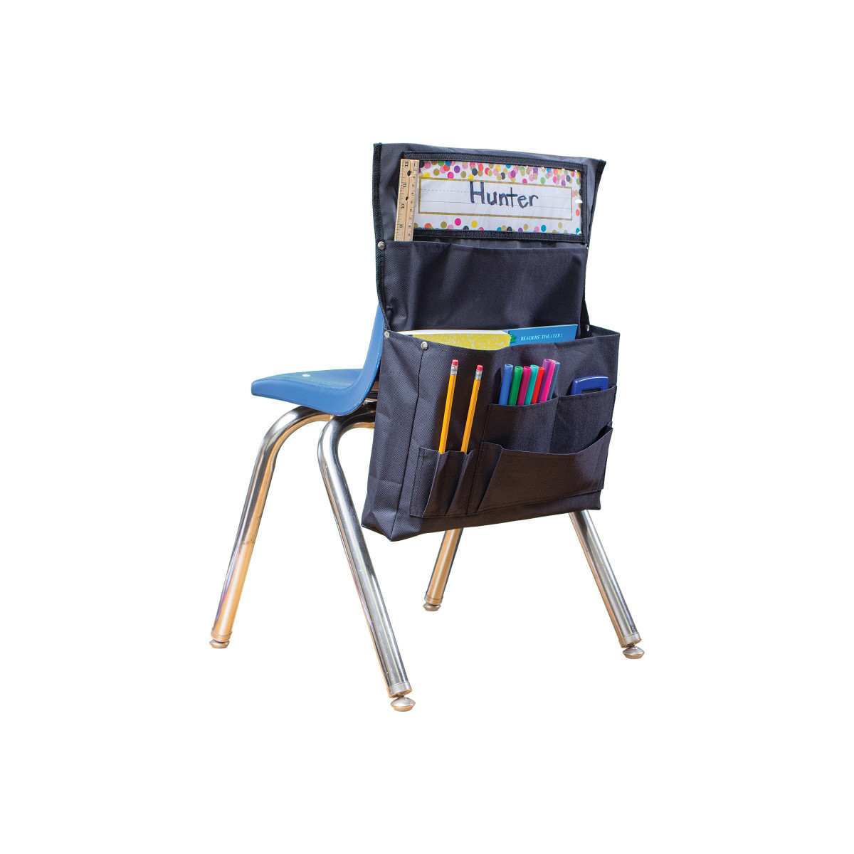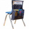 Organize supplies with this convenient storage solution. Clear pocket holds name plate up to 3.5" x 11.5". 7 storage areas: Large pockets are ideal for workbooks, folders, etc. and small pockets are ideal for supplies. Made with durable canvas. Metal rivets provide extra strength at stress points. Easily slides over back of chair up to 15" wide, 5" from top. Measures 15.5" x 18".