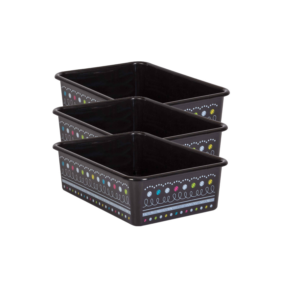 Create a beautifully organized classroom with these large storage bins. Keep books, notepads, toys, games, and supplies in these decorative organizers that feature a sturdy plastic design. Multiple bins can be stacked for easy storage. Each bin measures 16-1/4 "L x 11-1/2"W x 5"H. Sold as a pack of 3 bins.