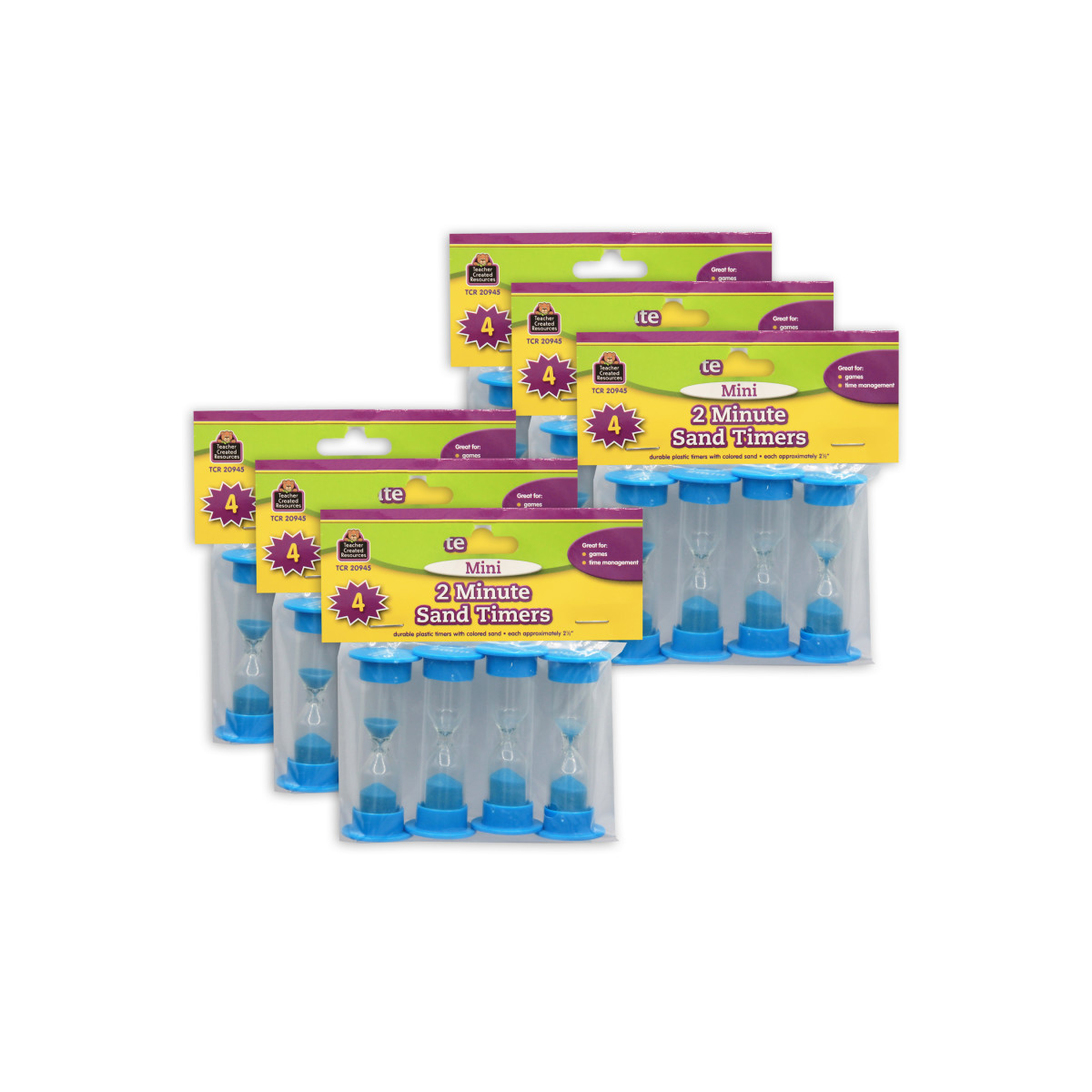 Race to see how much can be accomplished before time runs out. Great for games, timed tests, and time management. Handy plastic timers with colored sand. Includes suggested activities. Timers measure 1" x 2-1/2". Each pack includes 4 two-minute timers. Sold as 6 packs for a total of 24 timers.