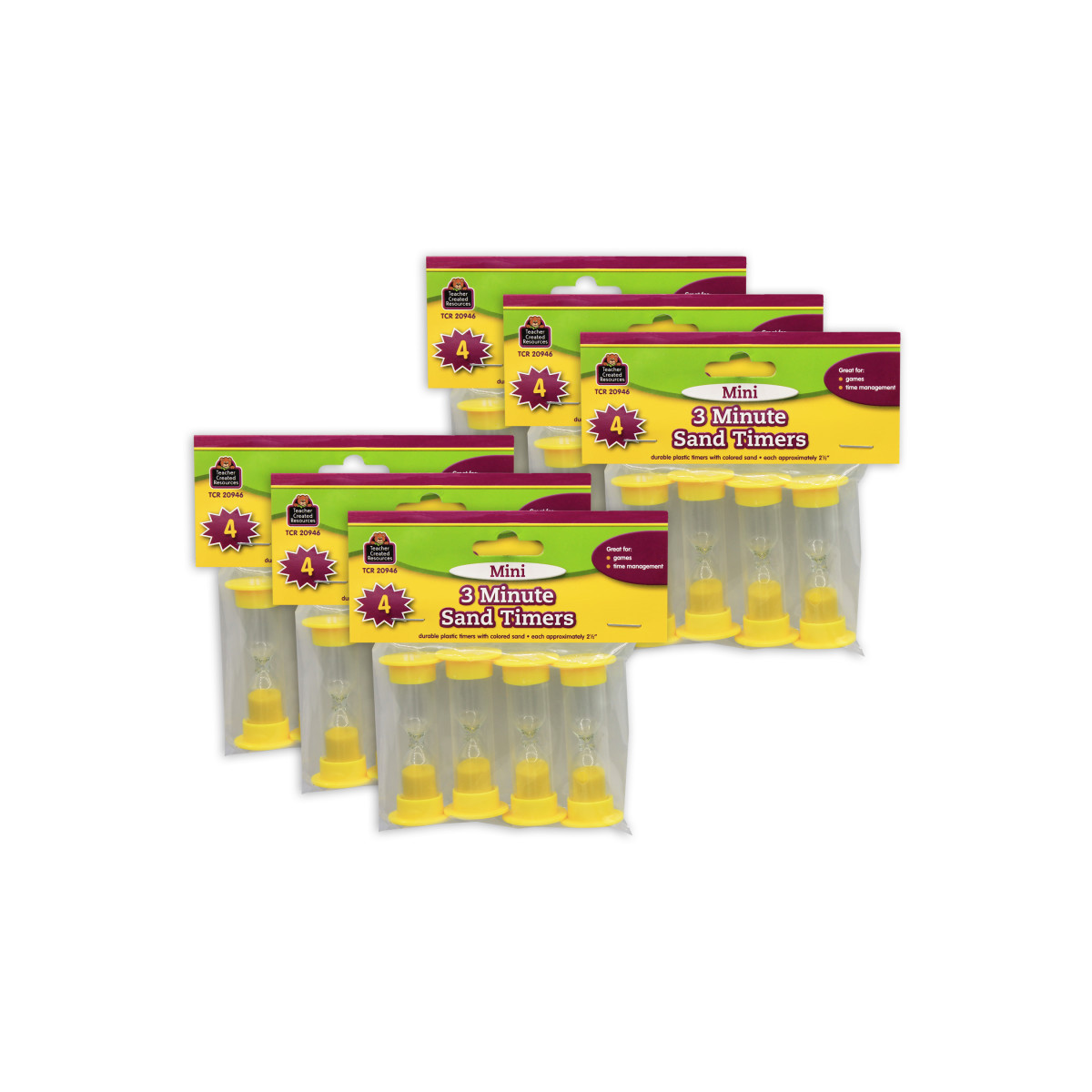 Race to see how much can be accomplished before time runs out. Great for games, timed tests, and time management. Handy plastic timers with colored sand. Includes suggested activities. Timers measure 1" x 2-1/2". Each pack includes 4 three-minute timers. Sold as 6 packs for a total of 24 timers.
