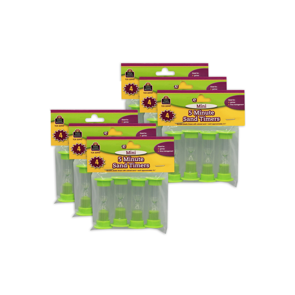 Race to see how much can be accomplished before time runs out. Great for games, timed tests, and time management. Handy plastic timers with colored sand. Includes suggested activities. Timers measure 1" x 2.5". Each pack includes 4 five-minute timers. Sold as 6 packs for a total of 24 timers.