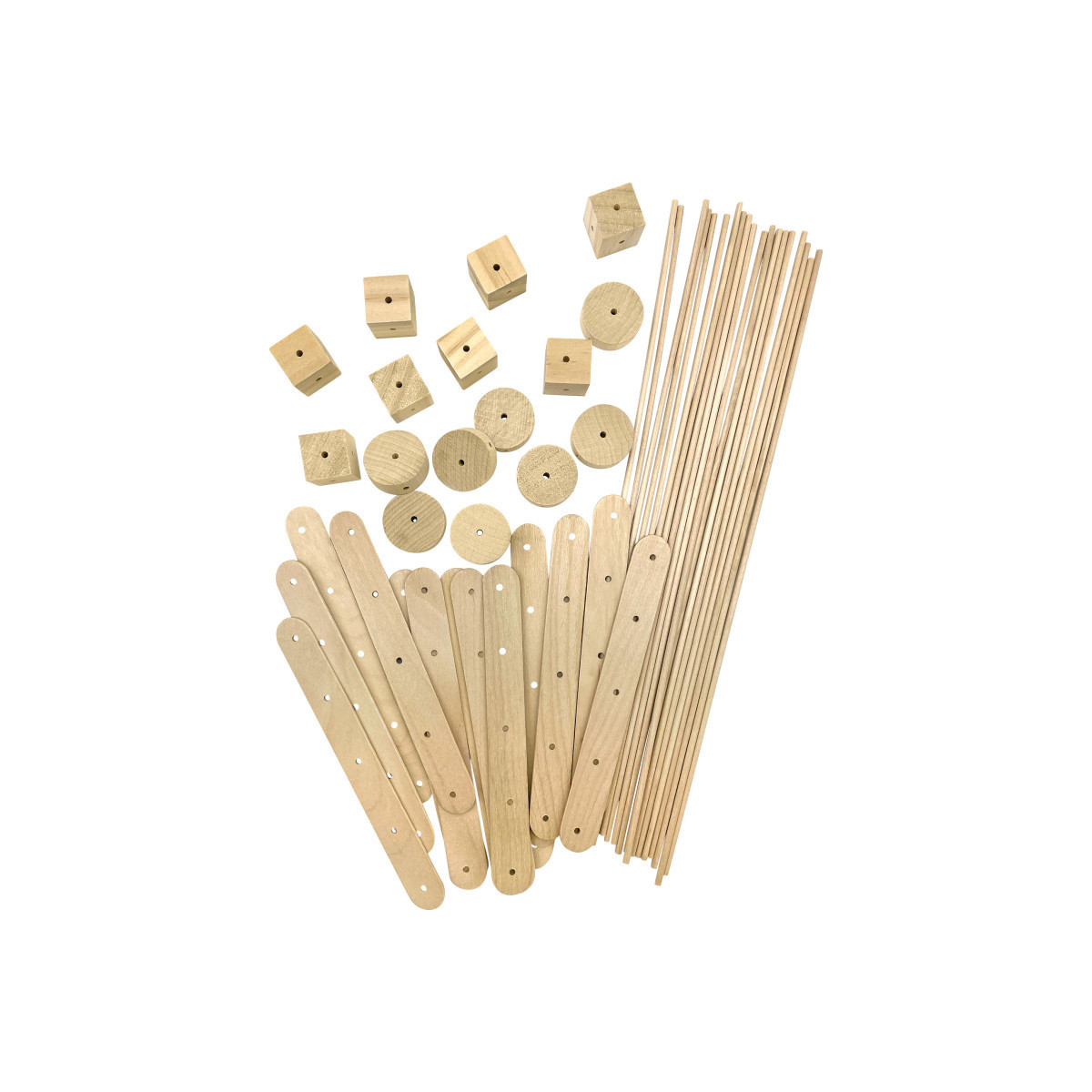 - Set includes 8 wheels (1-1/8" x 3/8"), 20 dowels (11-3/4" x 1/16"), 8 cubes (3/4" x 3/4"), 30 5-hole large craft sticks (6" x 3/4")