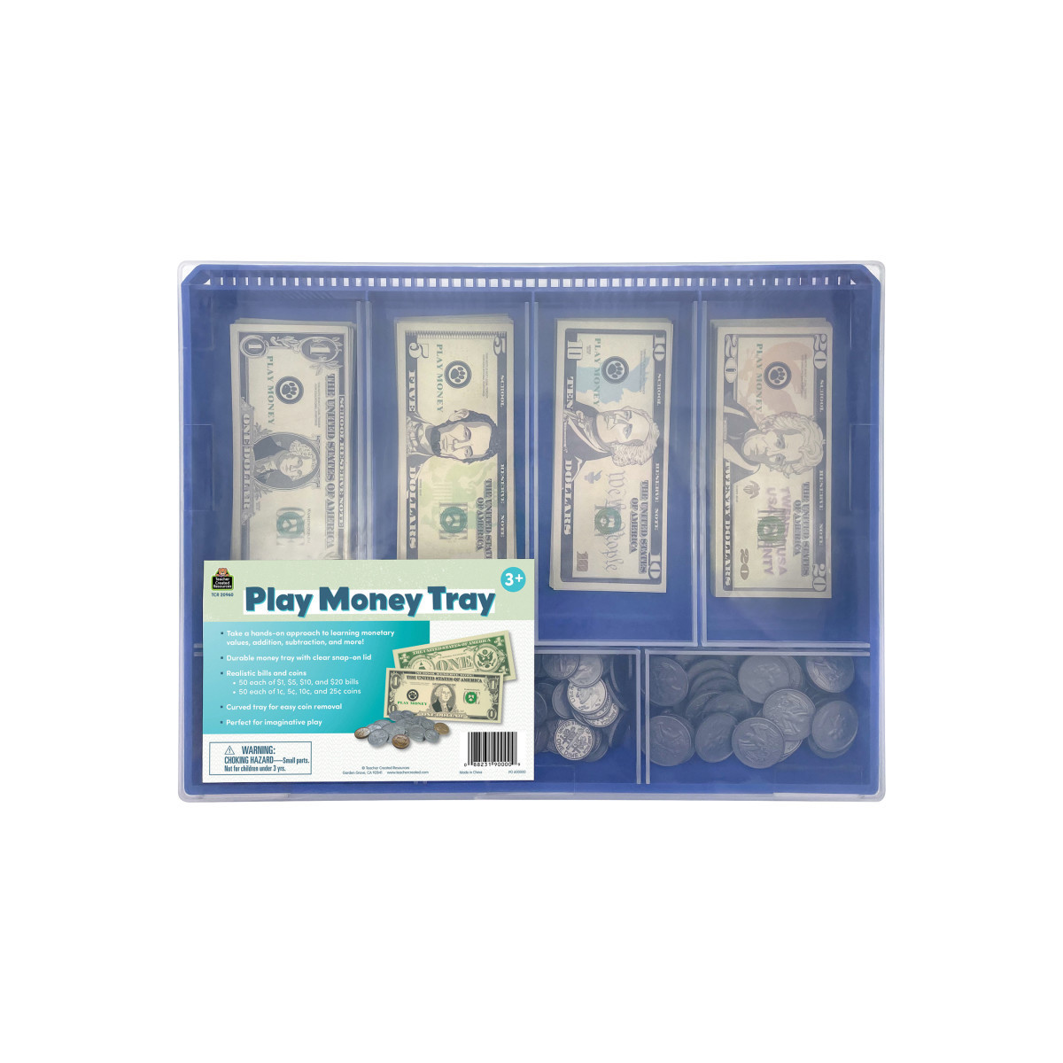 Take a hands-on approach to learning monetary values, addition, subtraction, and more! The realistic bills and coins are perfect for imaginative play. The coin compartments are curved for easy coin removal and has a clear snap-on lid for easy storage. Set includes 50 each of $1, $5, $10, $20 bills and 50 each of 1¢, 5¢, 10¢, and 25¢ coins.