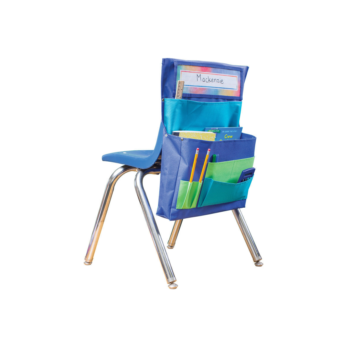 Organize supplies with this convenient storage solution. Clear pocket holds name plate up to 3.5" x 11.5". 7 storage areas: Large pockets are ideal for workbooks, folders, etc. and small pockets are ideal for supplies. Made with durable canvas. Metal rivets provide extra strength at stress points. Easily slides over back of chair up to 15" wide, 5" from top. Measures 15.5" x 18".