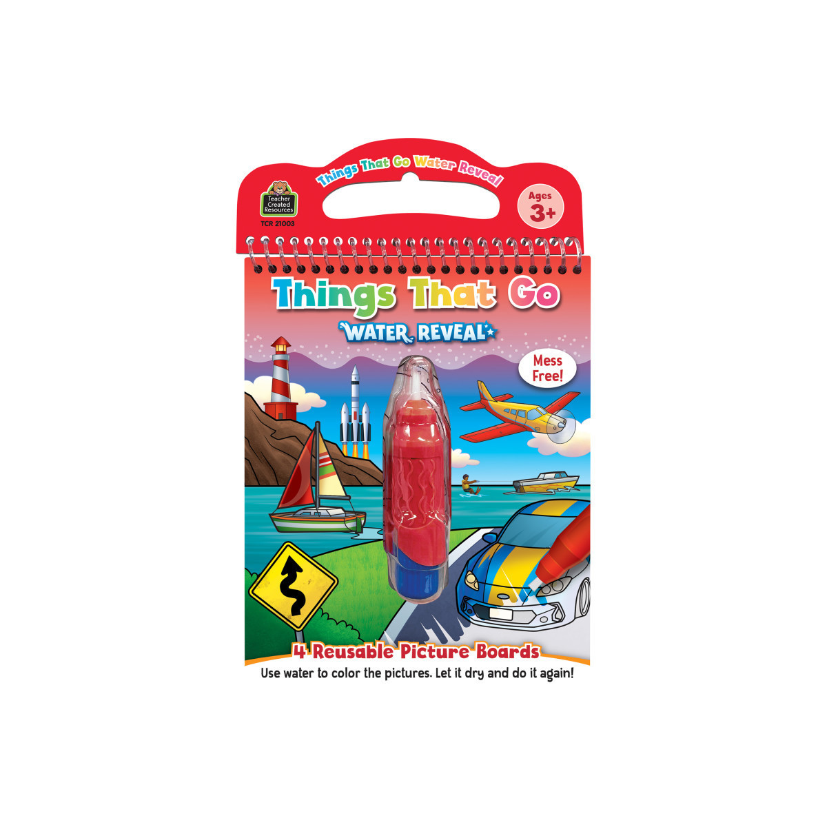 Mess free! Use water to color the pictures. Let it dry and do it again! Each board has search and find activities plus an educational fact. Students will travel by plane, boat, car, and rocketship in this educational adventure. Includes 4 reusable picture boards and 1 refillable water pen.