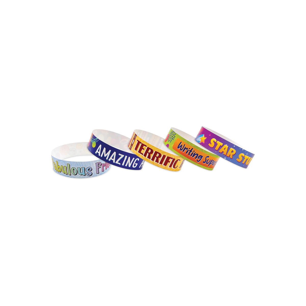 Praise writing superstars, cheer on fabulous friends, and applaud awesome attitudes with a brag bracelet! Each bracelet is a reflection of an achievement and a token of encouragement. Bracelets are made from premium tear-proof, synthetic paper. Adhesive closure allows for bracelets to be adjusted and/or removed without damage. Approximately 9-7/8" x 3/4". Each pack includes 100 pieces: 10 each of 10 designs.