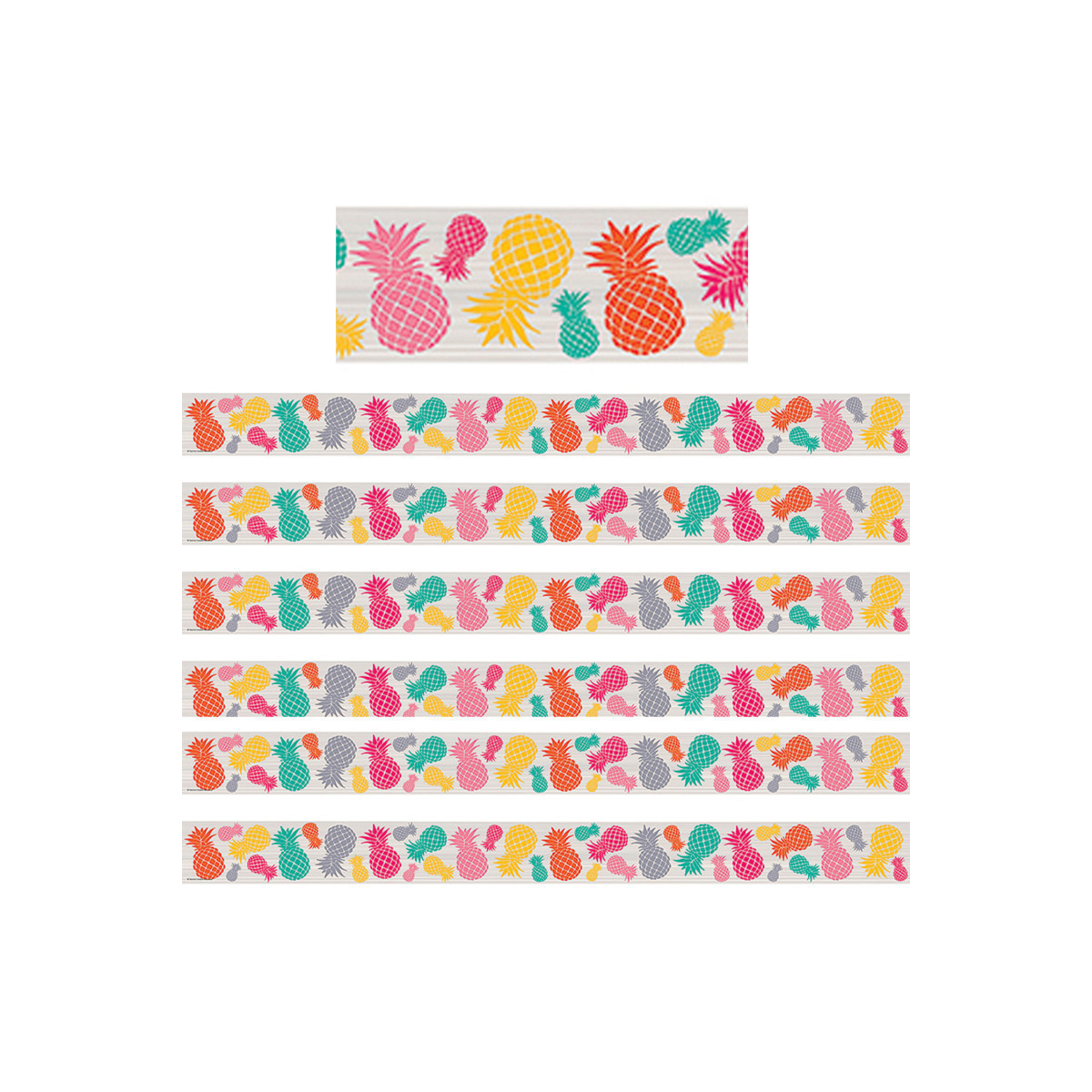 Use colorful border trim to liven up your classroom! Create fresh looks for bulletin boards, windows, walls, and class projects. Mix and match with coordinating products (stickers, notepads, awards, etc.) for a classroom theme. Coordinates with other Tropical Punch products. Each piece is 35'' x 3''. Each pack includes 35 feet of trim. Sold as 6 packs for a total of 210 feet of border trim (72 strips).