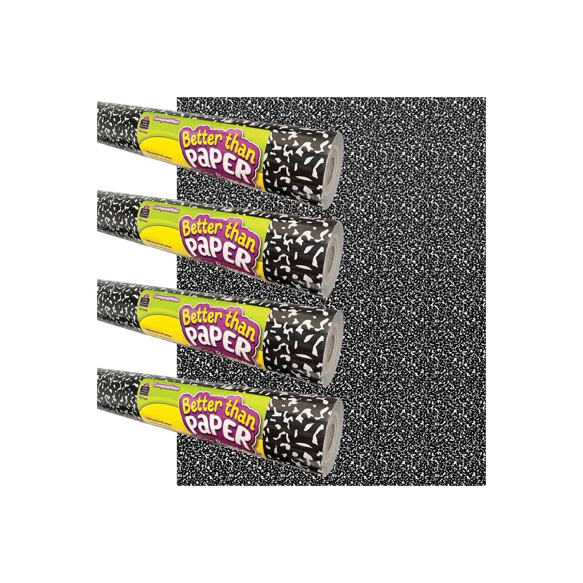 Bring a timeless classroom essential to your walls with the iconic black-and-white marbled design of a classic composition notebook. This revolutionary nonwoven fabric makes creating beautiful bulletin board backdrops quick and easy! The composition notebook design is one that everyone will recognize, and the lightweight material is simple to hang—no more struggling with paper that wrinkles and tears. Attach border trim, accents, posters and student work with staples or tape and remove without ripping or leaving conspicuous holes. Plus, the durable write & wipe surface can be used again and again! Each roll measures 4' x 12'. Sold as a pack of 4 rolls.