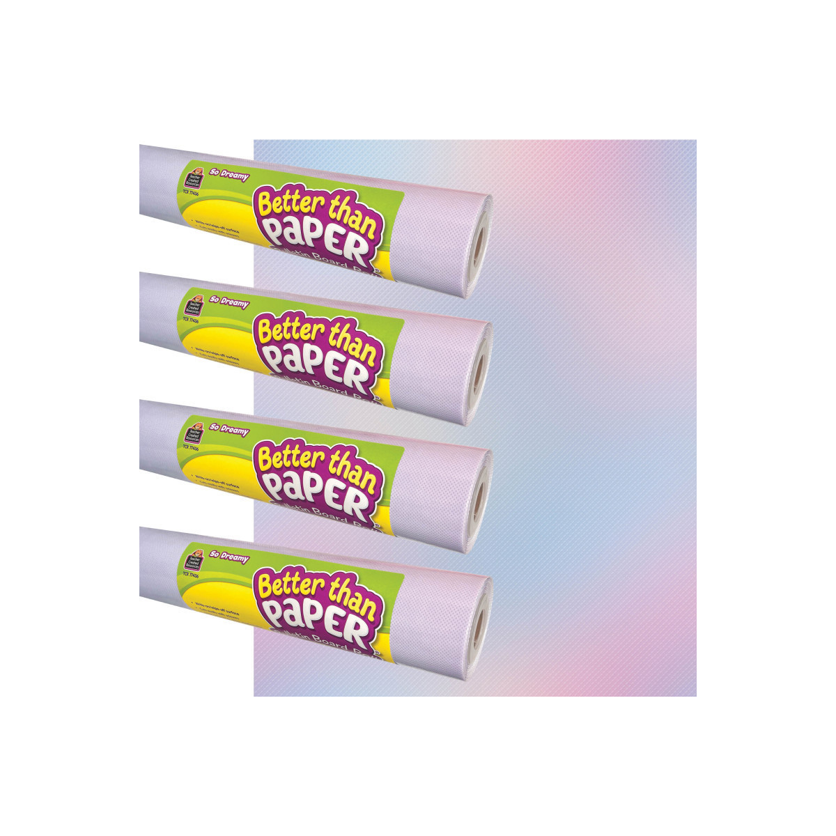 This revolutionary fabric makes creating beautiful bulletin board backdrops quick and easy! The iridescent colors bring a dreamy charm to any classroom setting,...and the lightweight material is simple to hang—no more struggling with paper that wrinkles and tears. Attach border trim, accents, posters and student work with staples or tape and remove without ripping or leaving conspicuous holes. Plus, the durable write & wipe surface can be used again and again! Each roll measures 4' x 12'. Sold as a pack of 4 rolls.
