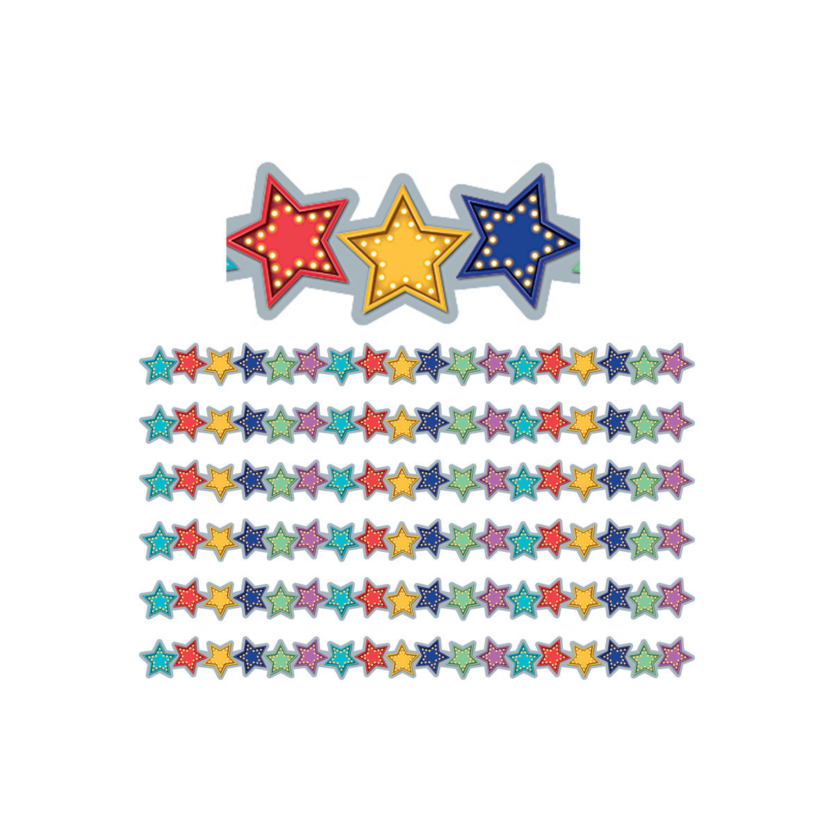 Use colorful border trim to liven up your classroom! Create fresh looks for bulletin boards, windows, walls, and class projects. Mix and match with coordinating products (stickers, notepads, awards, etc.) for a classroom theme. Each pack has 12 pieces (2.75'' x 35'') for a total length of 35 feet of trim. Sold as 6 packs for a total of 72 strips (210 feet).