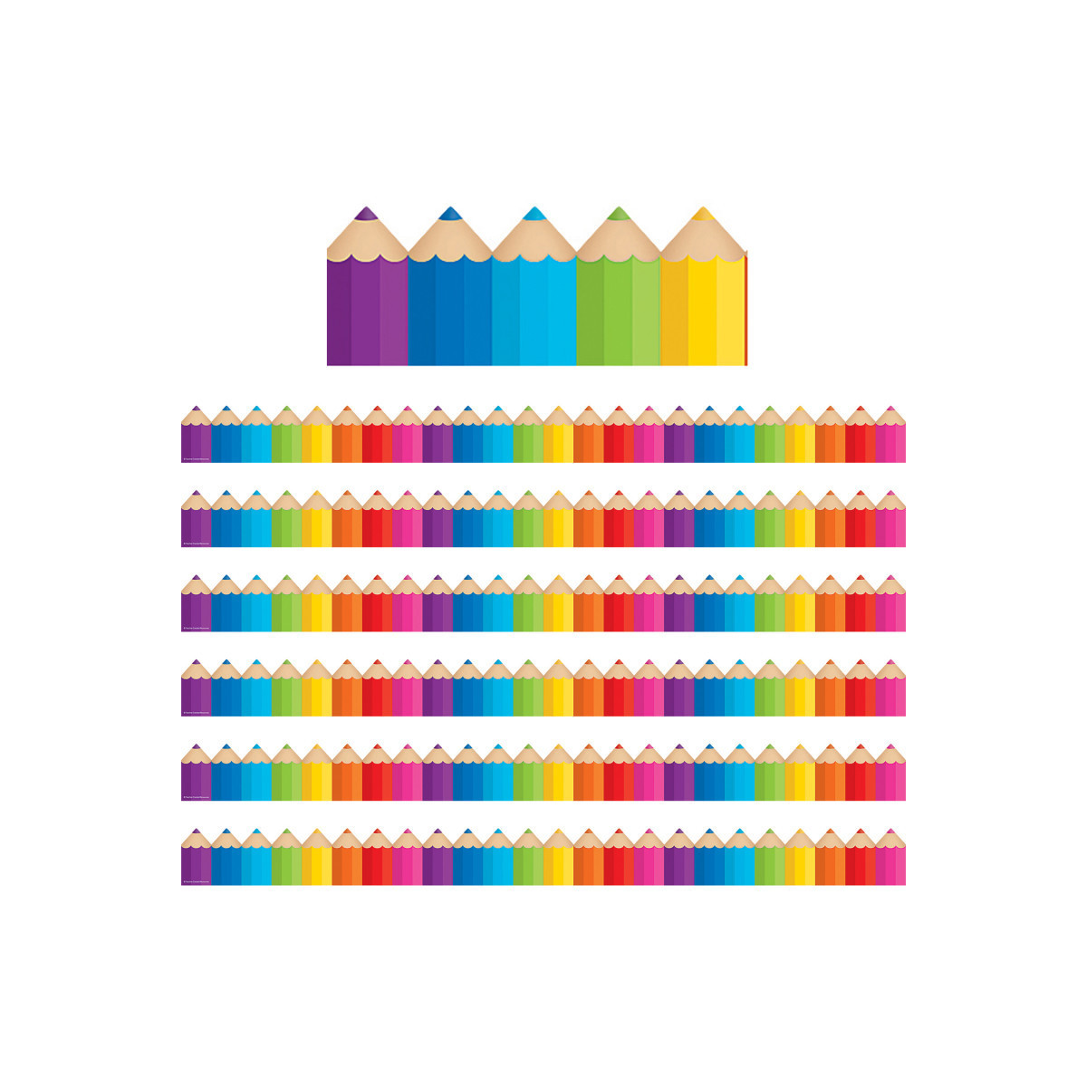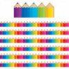 Use colorful border trim to liven up your classroom! Create fresh looks for bulletin boards, windows, walls, and class projects. Mix and match with coordinating products (stickers, notepads, awards, etc.) for a classroom theme. Each piece is 35'' x 2 3/4''. Each pack includes 35 feet of trim. Sold as 6 packs for a total of 210 feet of trim.