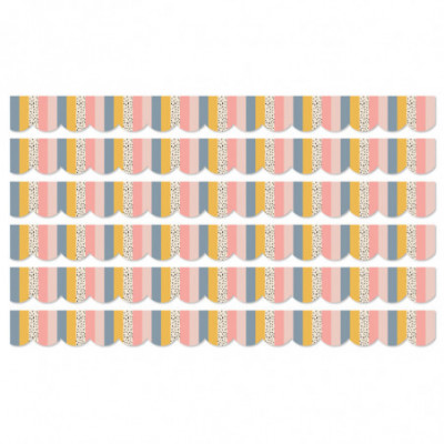 Use colorful border trim to liven up your classroom! Create fresh looks for bulletin boards, windows, walls, and class projects. Mix and match with coordinating products (stickers, notepads, awards, etc.) for a classroom theme. Each pack has 12 pieces (2¾" x 35") for a total length of 35 feet of trim!