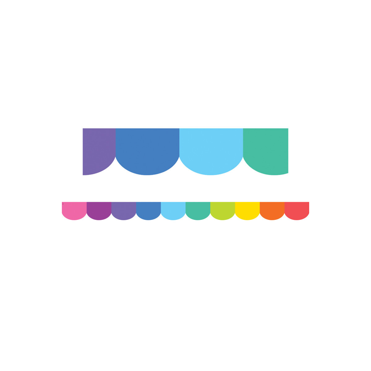 Use Colorful Scalloped Die-Cut border trim to liven up your classroom! Create fresh looks for bulletin boards, windows, walls, and class projects. Mix and match with coordinating products (stickers, notepads, awards, etc.) for a classroom theme. Each pack has 12 pieces (2-3/16" x 35") for a total length of 35 feet of trim!
