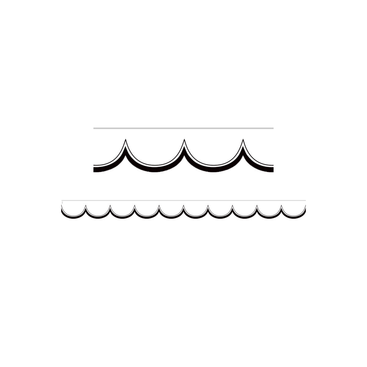 Use White and Black Scalloped Die-Cut Scalloped border trim to liven up your classroom! Create fresh looks for bulletin boards, windows, walls, and class projects. Mix and match with coordinating products (stickers, notepads, awards, etc.) for a classroom theme. Each pack has 12 pieces (2-3/16" x 35") for a total length of 35 feet of trim!