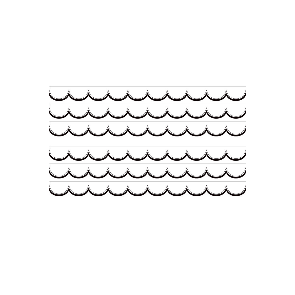 Use White and Black Scalloped Die-Cut Scalloped border trim to liven up your classroom! Create fresh looks for bulletin boards, windows, walls, and class projects. Mix and match with coordinating products (stickers, notepads, awards, etc.) for a classroom theme. Each pack has 12 pieces (2-3/16" x 35") for a total length of 35 feet of trim! Sold as 6 packs for a total of 72 pieces (210 feet).