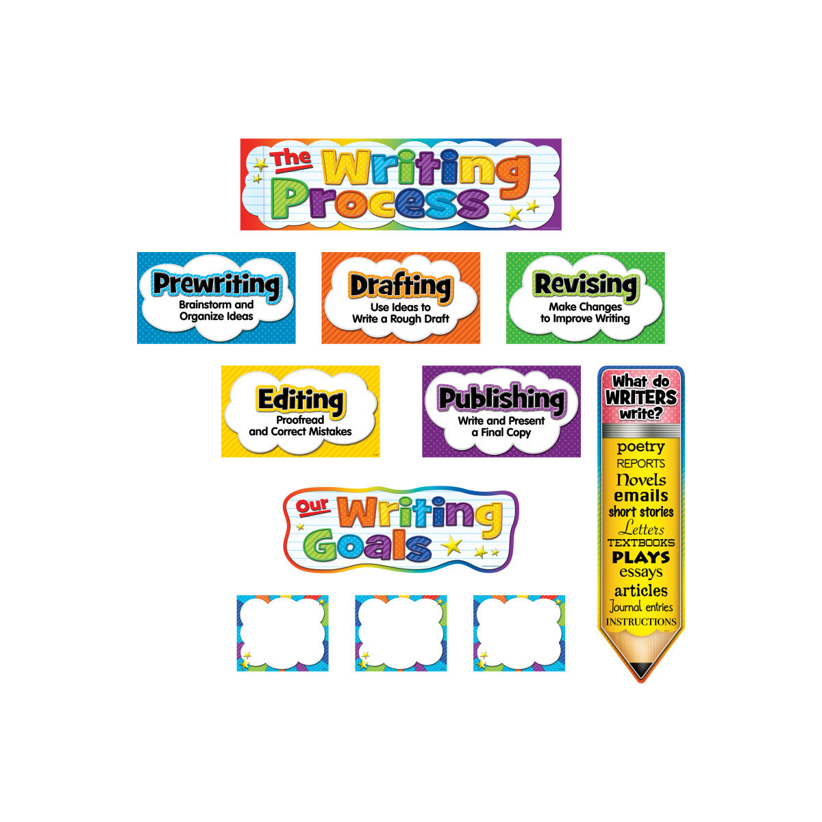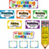 Display this colorful bulletin board as a visual reference for students to keep track of where they are in the writing process. The header piece measures 21" x 6". 19 total pieces.