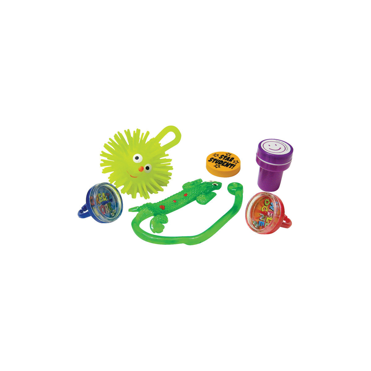 Reward good behavior or good work. Recognize a birthday or special achievement. Children will enjoy choosing from this reward pack! Each pack includes 4 sticky lizards, 14 rings, 4 erasers, 4 stampers, and 2 smiling face balls.