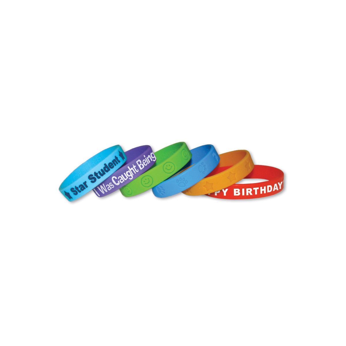 Build awareness for special people or events with wristbands made of silicone. Latex Free. Tested and compliant with all Consumer Product Safety Commission standards. Includes 4 each of 6 designs: Star Student, I Was Caught Being Good, Happy Faces, Paw Prints, Stars, and Happy Birthday.