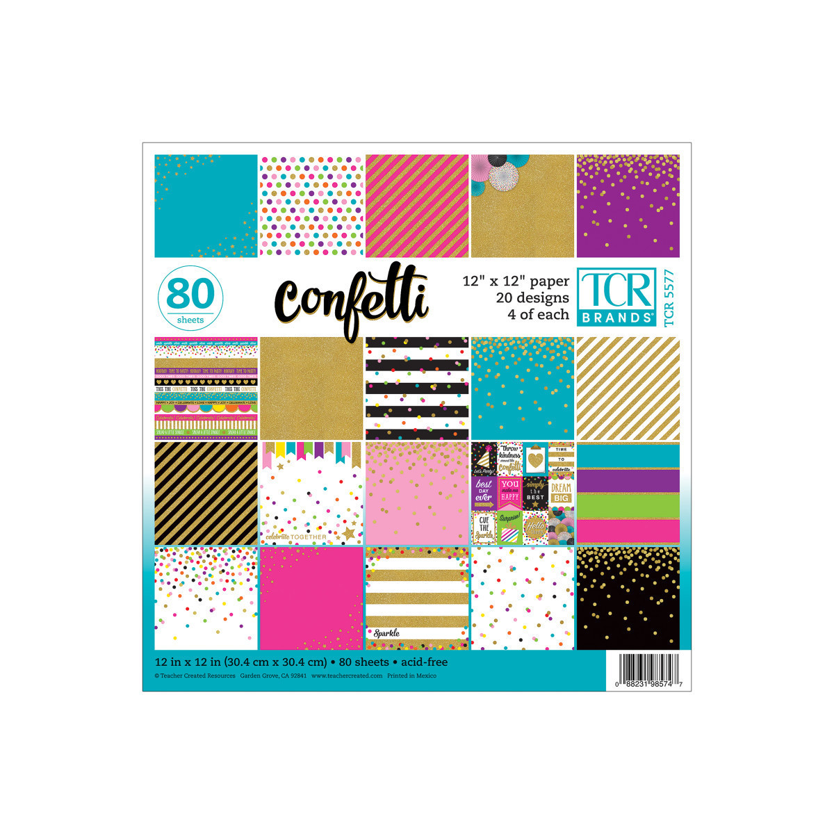 Create one of-a-kind projects with this beautiful designer paper. Use the fun and festive designs as a backdrop to display student work; create classroom scrapbook pages; make paper fans, flowers, and pennants; use it for attention-grabbing notes and messages; and create customized decoupage frames and accessories. Paper is 12" x 12". Each book includes 80 sheets: 4 each of 20 designs