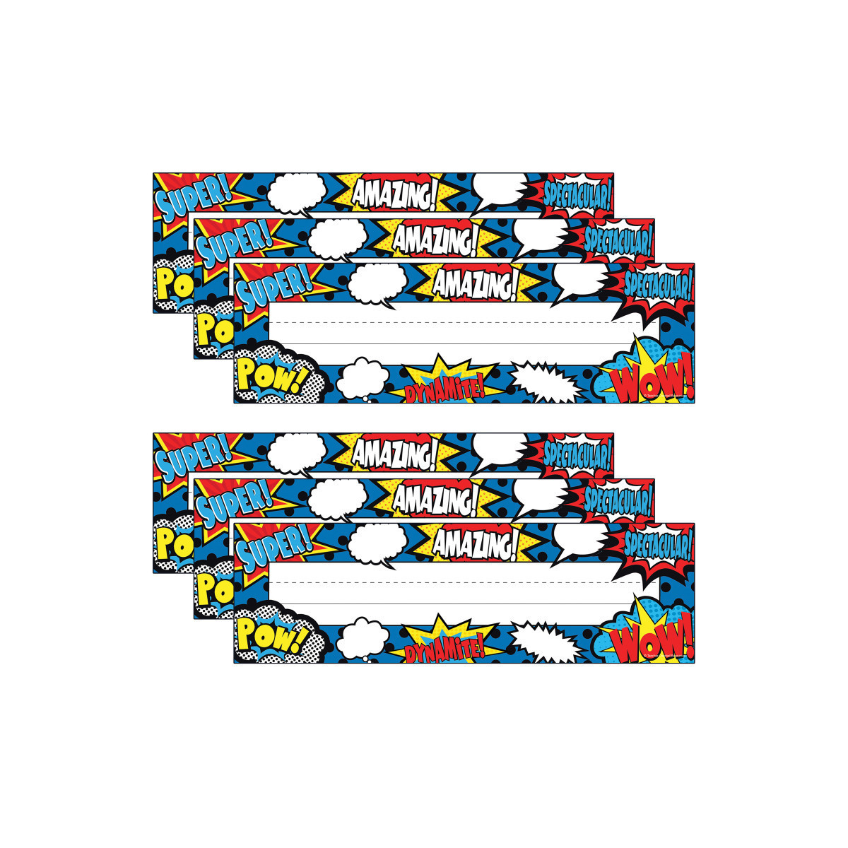 Use them to help teachers and substitute teachers learn students' names. Use them to label learning centers, storage areas, and portfolio collections. Laminate them for use as vocabulary flash cards, or work bank labels. Measures approximately 3.5" x 11.5". Each pack includes 36 pieces. Sold as 6 packs for a total of 216 name plates.