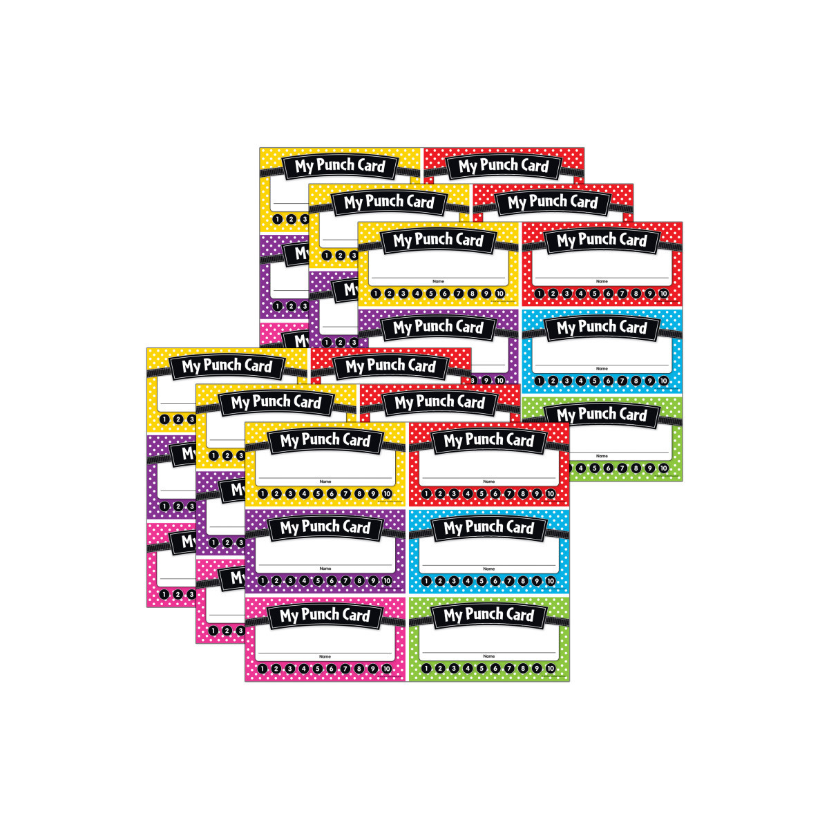 Use these colorful punch cards to motivate students to complete tasks, demonstrate good behavior, and achieve goals. When all of the punches are complete reward their accomplishment with a special treat! Each pack includes 60 cards. Sold as 6 packs for a total of 360 punch cards.